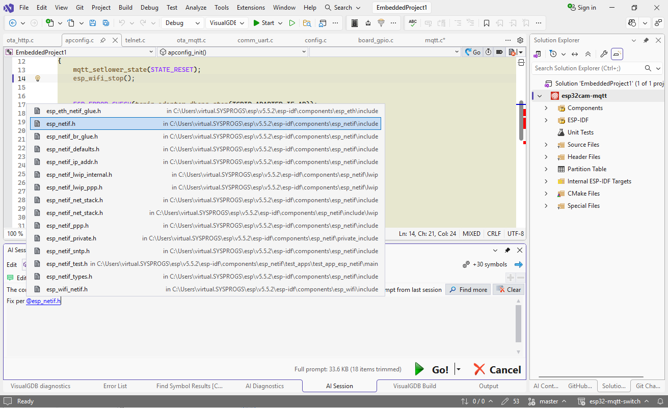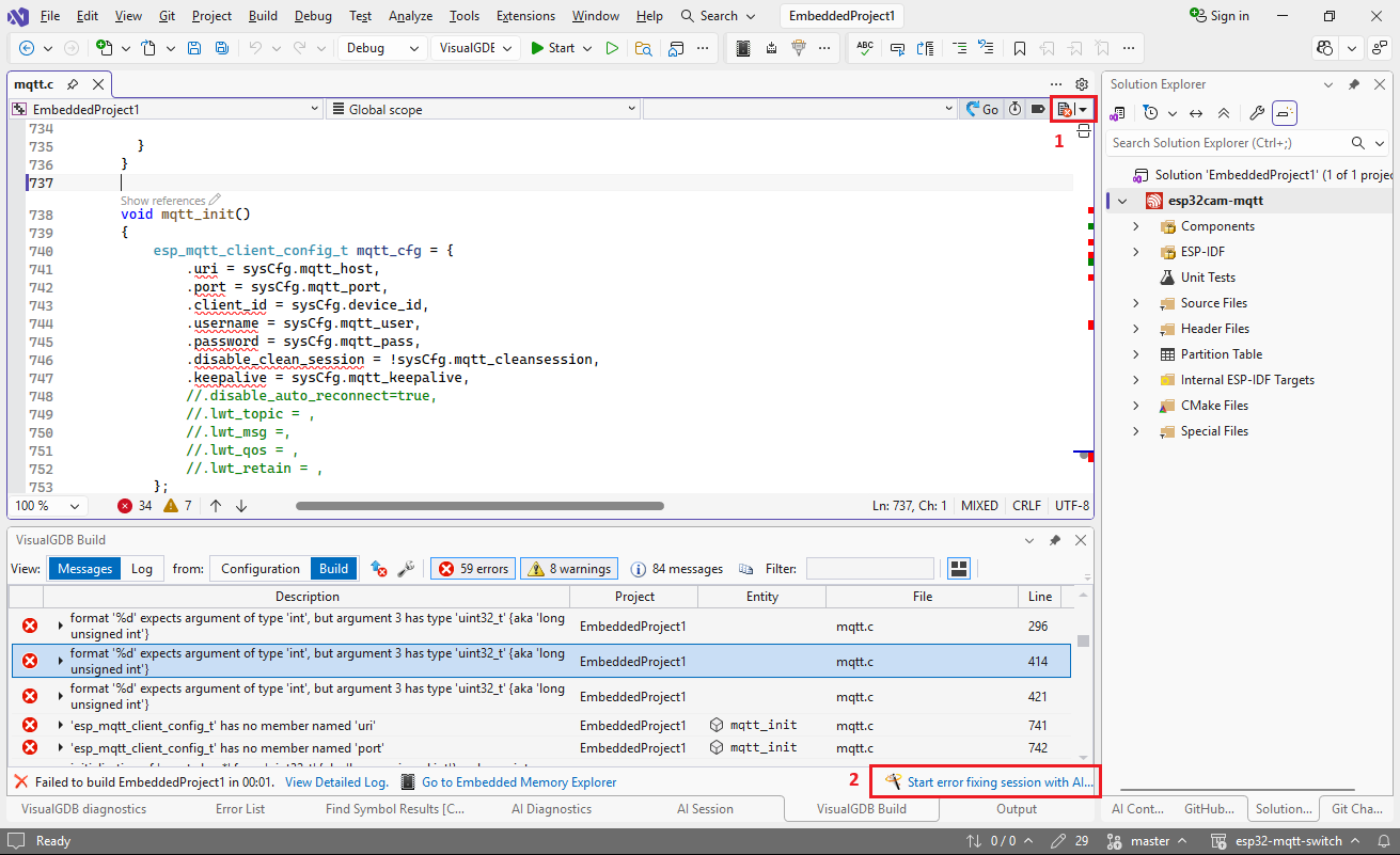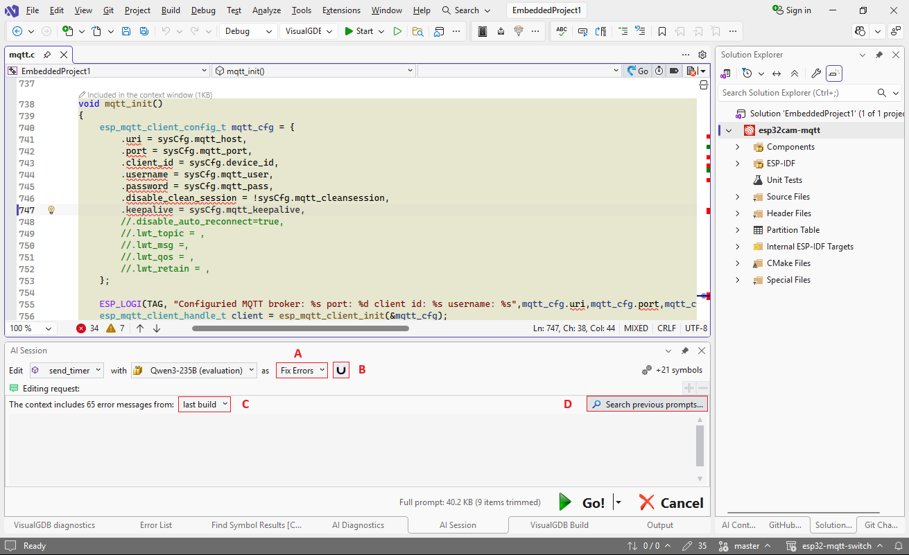 You can start an error-fixing session using the button in the top right corner of the editor (1) or a link in the error list (2) :Note that the former will use the IntelliSense errors for the current file (no build required), and the latter will use the build errors, giving you a chance to filter them:If you want to handle one symbol at a time, you can start a regular editing session, and switch the template to “Fix Errors” (A):The references button (B) controls whether the model will see the related declarations. E.g. in the example above, the errors are caused by a changed definition of esp_mqtt_client_config_t, so sharing it with the model will help it update the initialization without any hallucinations. On the other hand, if the errors are obvious without looking at any other files, you can turn this option off to save time and tokens.