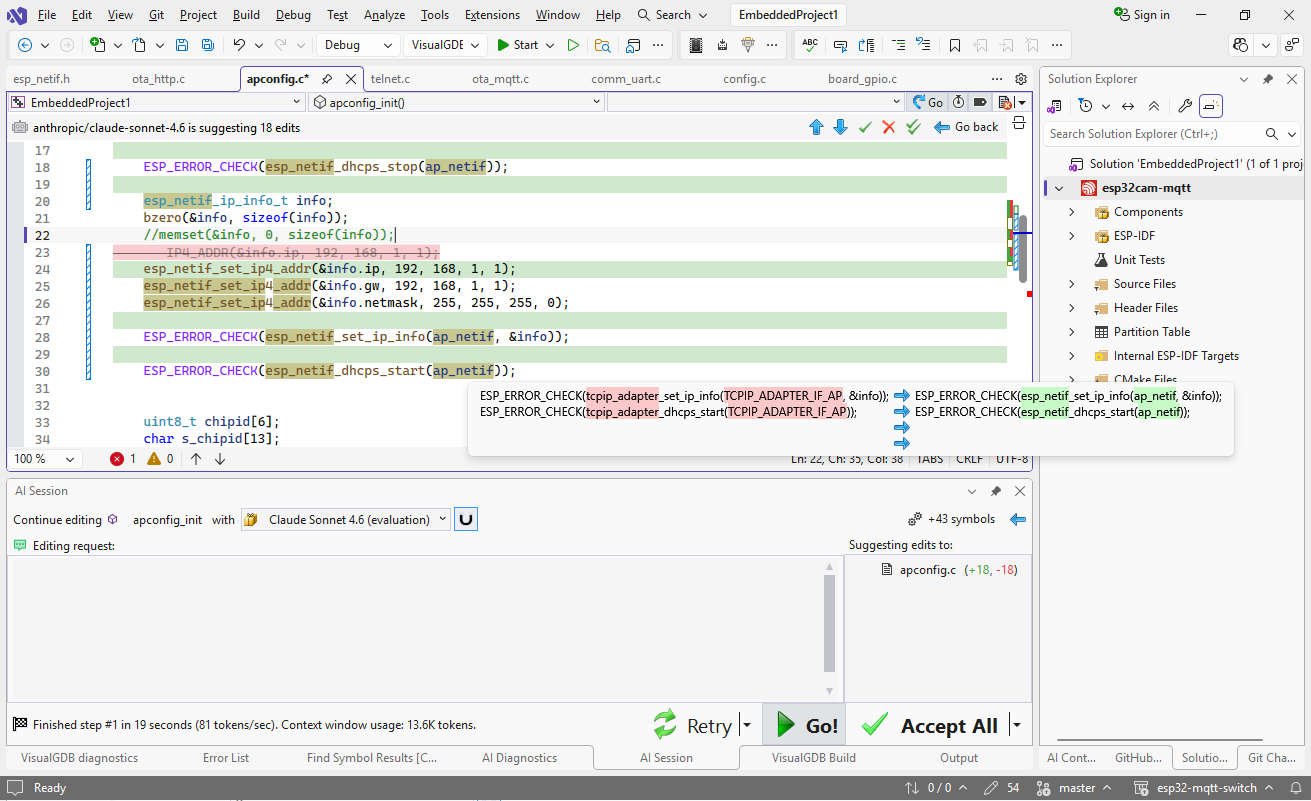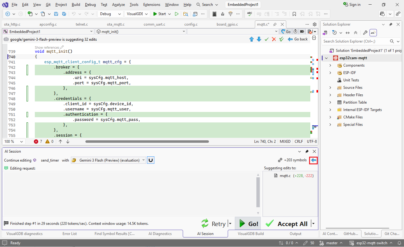 VisualGDB automatically provides basic instructions to the model, and injects the error messages right into the code, so the prompts can be very concise. E.g. if an error is caused by using printf(“%d”) on an unsigned variable, the request can be just “update format strings” or “keep format strings, add cast“.