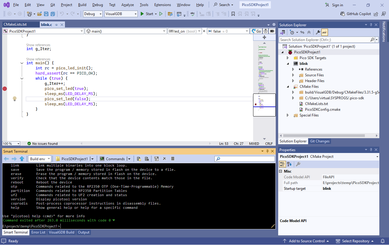 VisualGDB’s Smart Terminal is fully aware of the PicoSDK tools. You can open the terminal for a PicoSDK-based project and directly run tools like picotool: