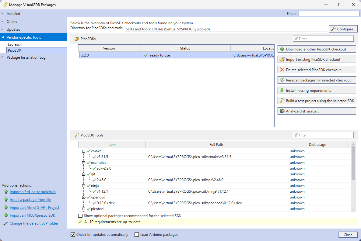 Starting from VisualGDB 6.1, you can use the same toolchains and auxiliary tools (e.g. picotool) as used by the VS Code extension. This is achieved by picking “Toolchains from PicoSDK” in the toolchain selector: