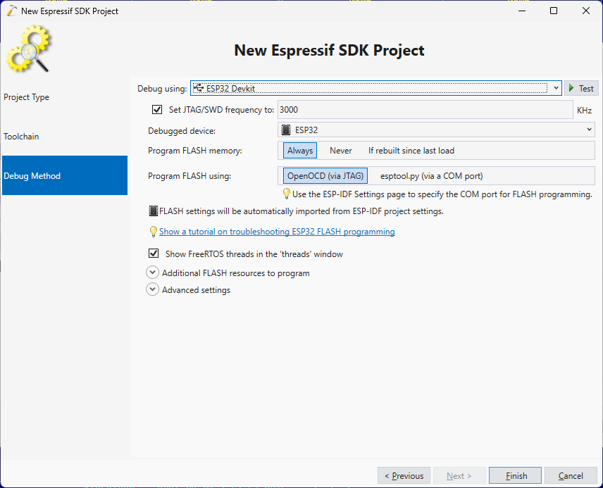- Finally, you can enter the debug settings matching your board, or just proceed with the default ones: