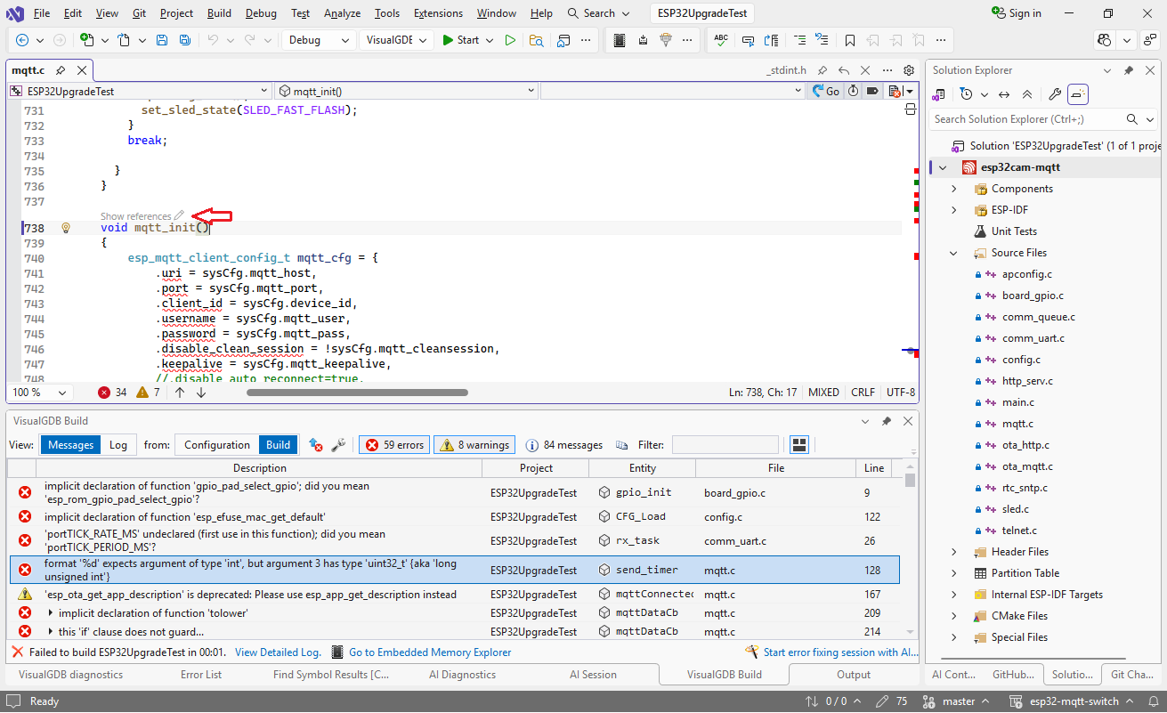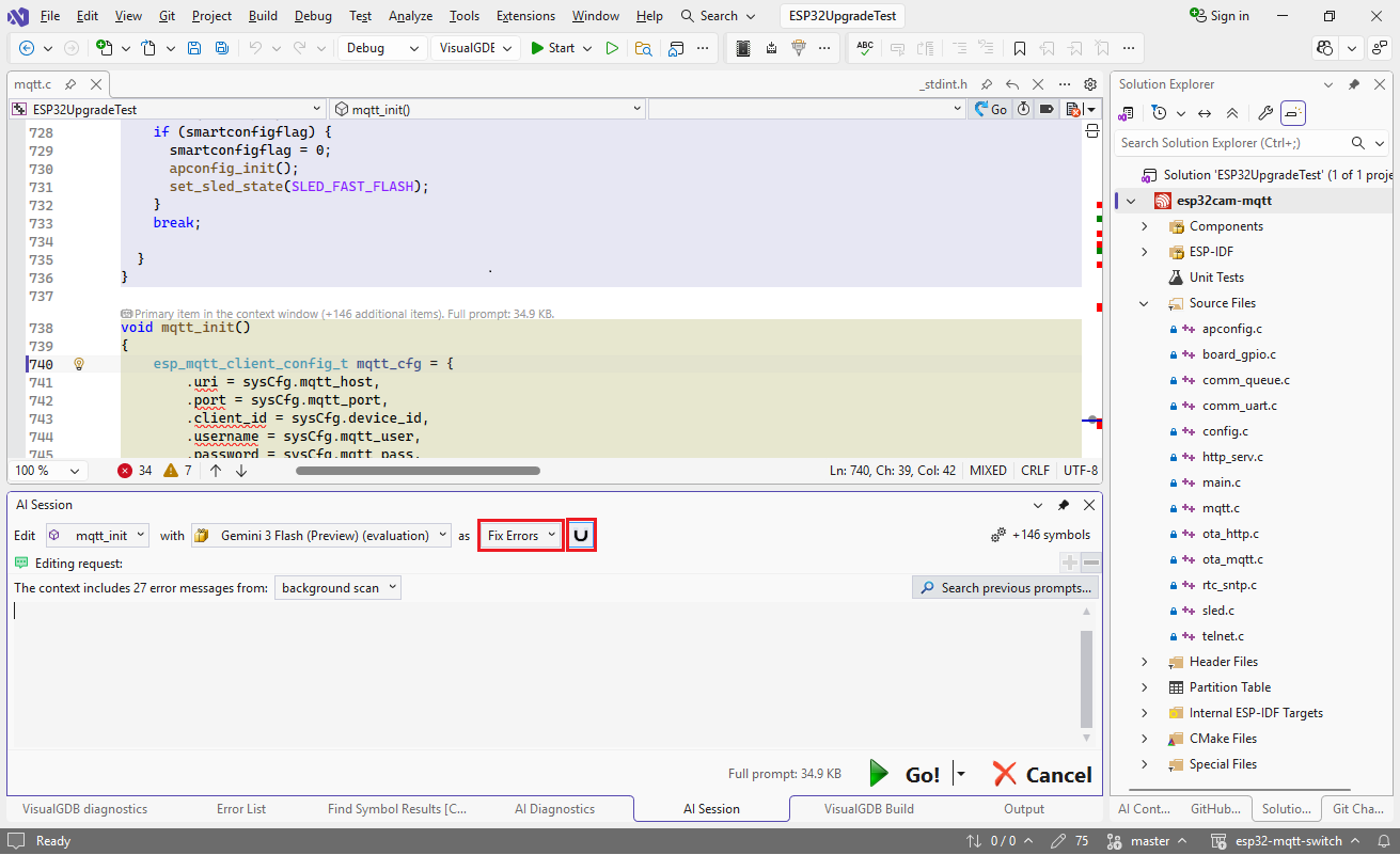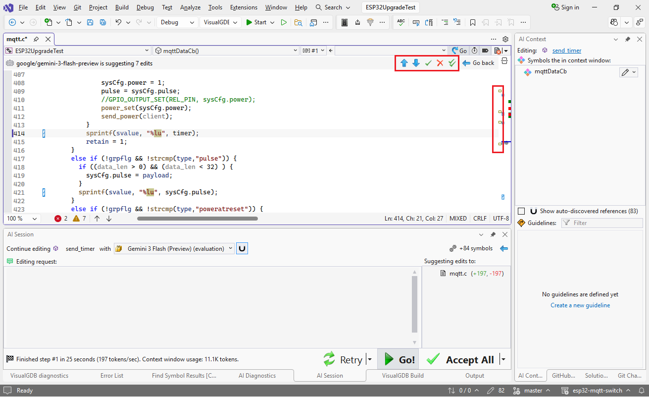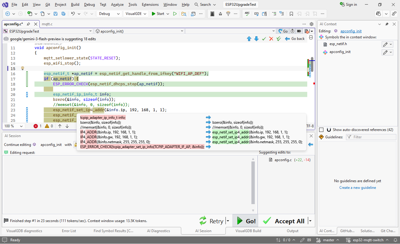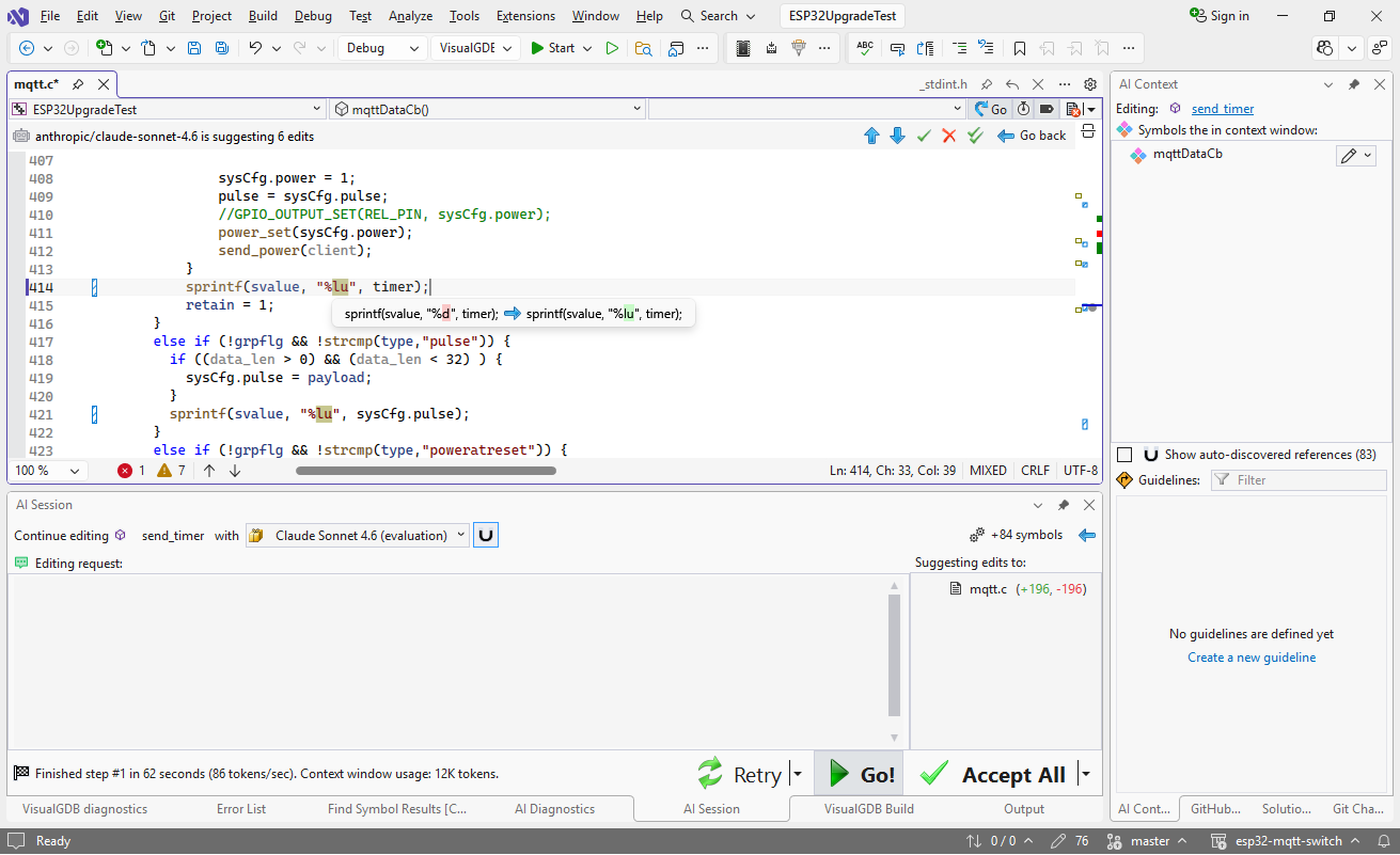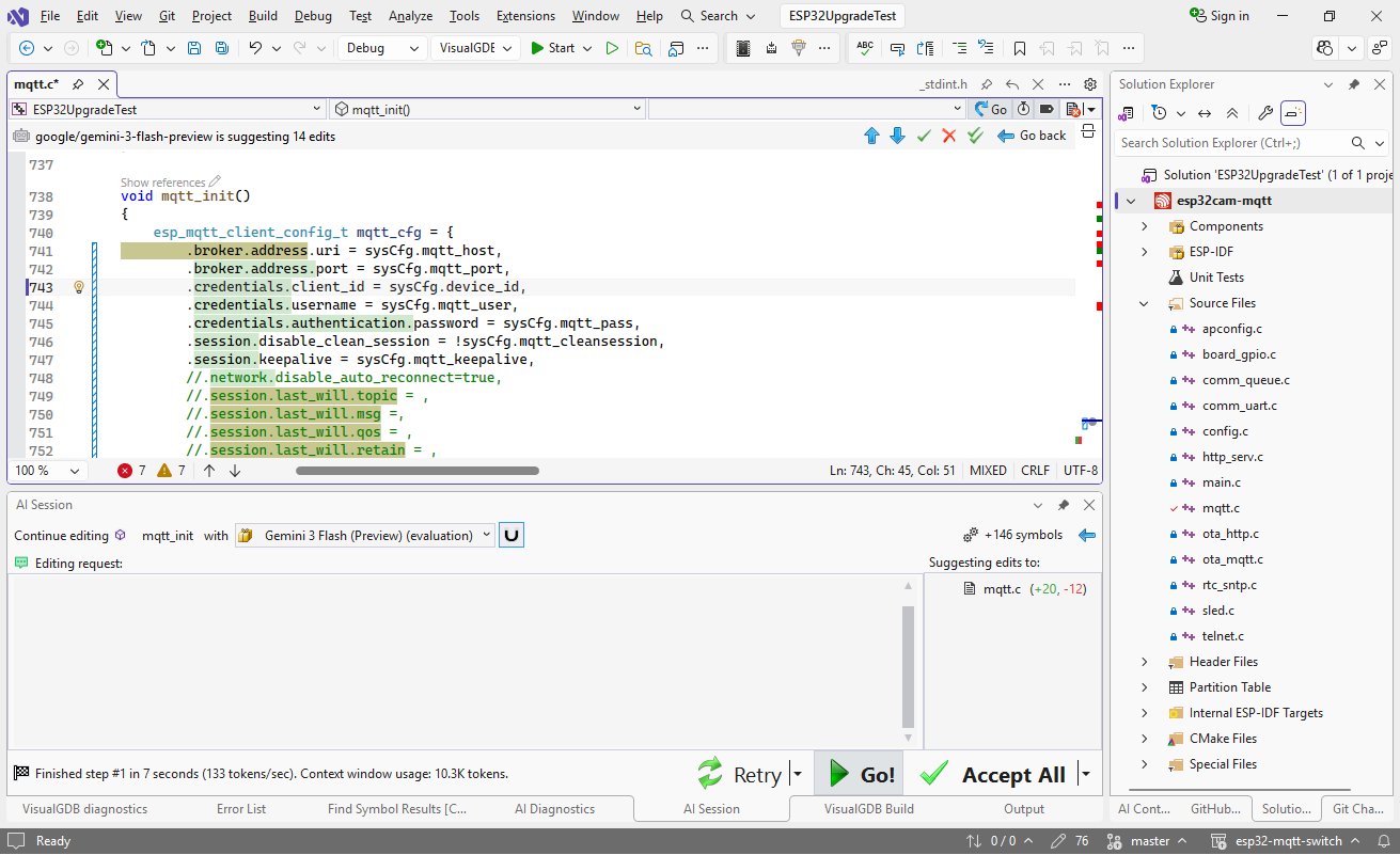 If you look closely, many of them have similar causes. E.g. the MQTT configuration struct now uses nested structs (see the migration guide) and using signed format specifier (%d) for uint32_t now causes a compiler error. - Most of the errors are rather trivial to fix, as soon as you look at the correct definitions. However, since the definitions are spread between multiple header files, many classical AI tools will take too long to produce meaningful results. We will now use VisualGDB’s symbol-level edits to quickly fix the errors without spending too many tokens. Click on the edit button above mqtt_init():