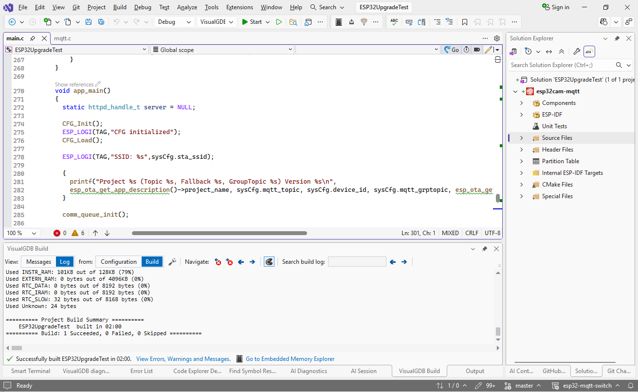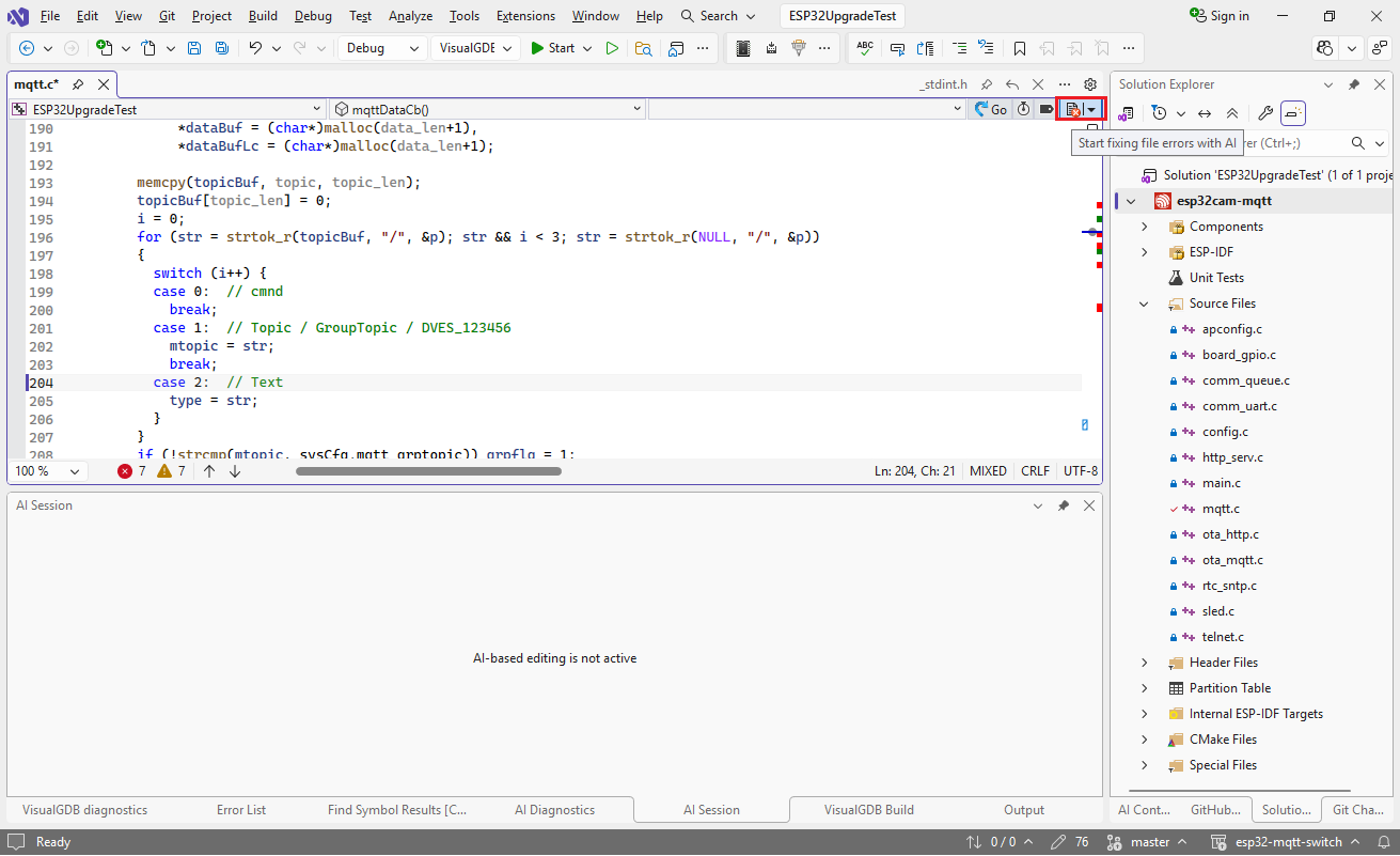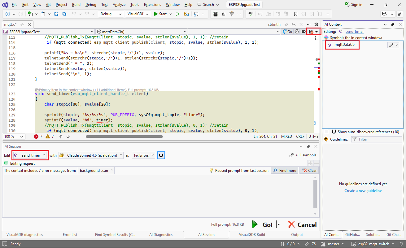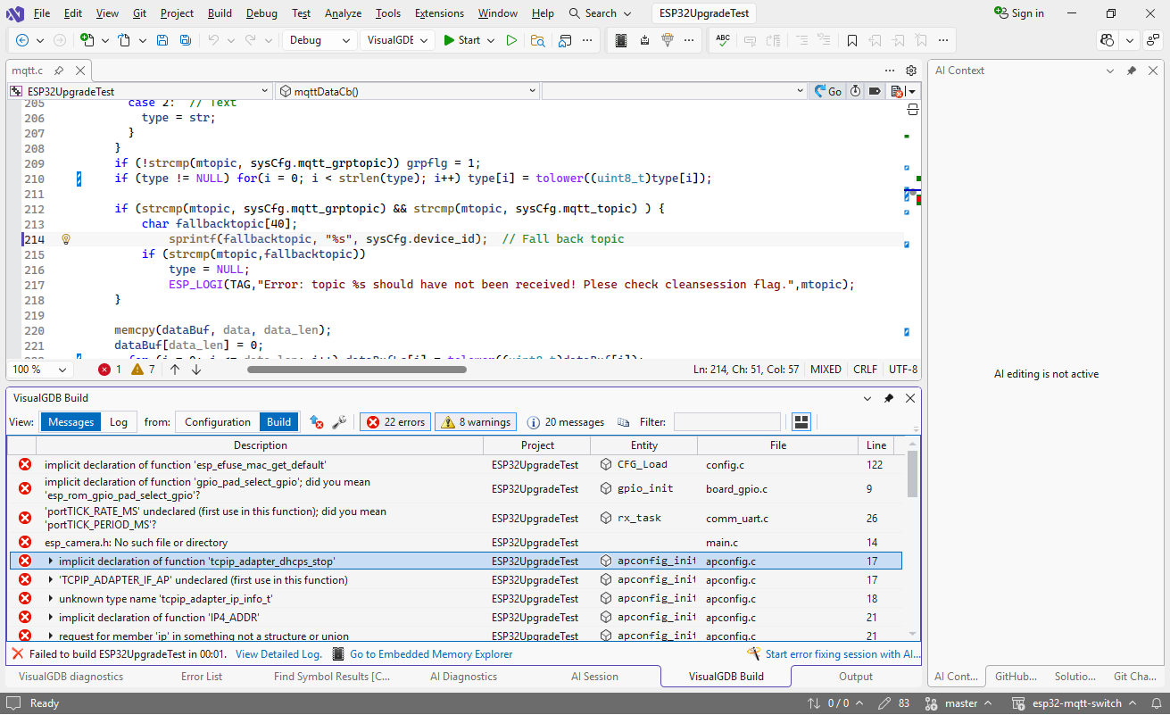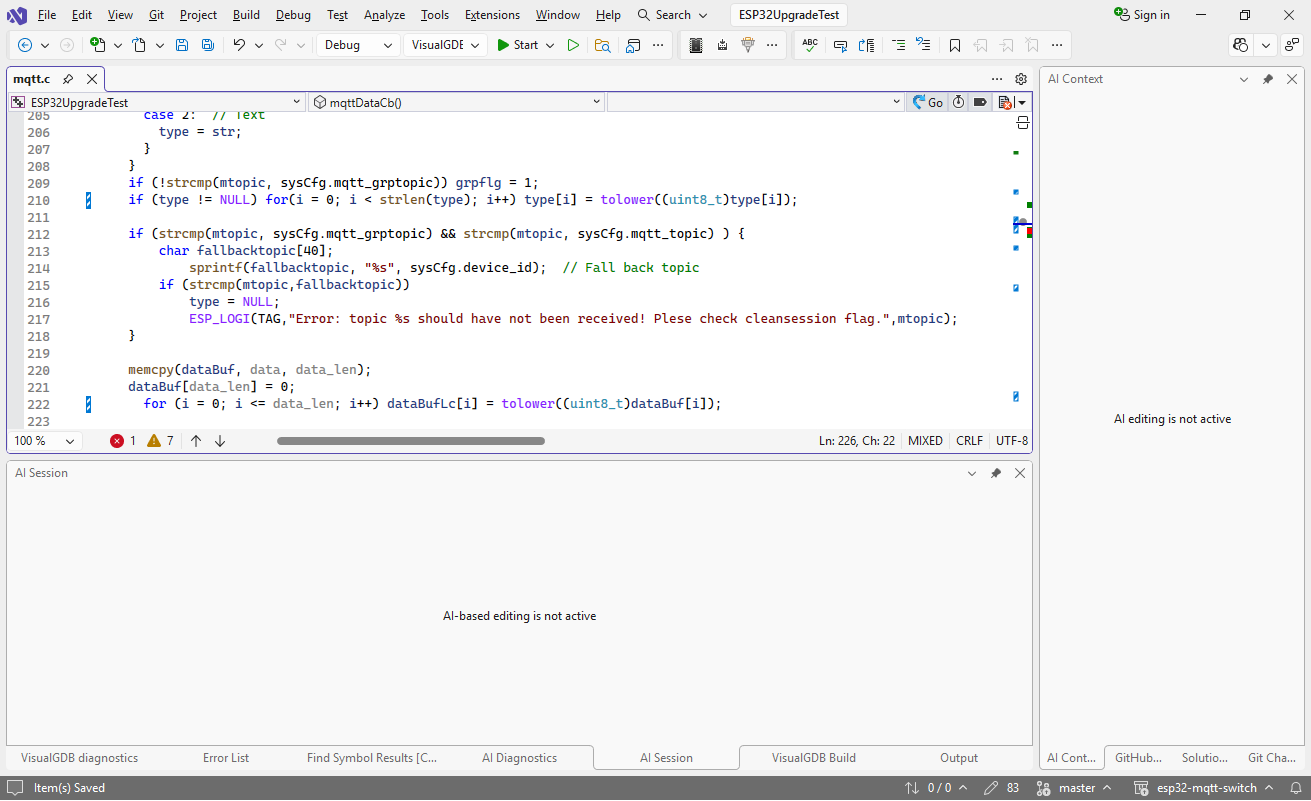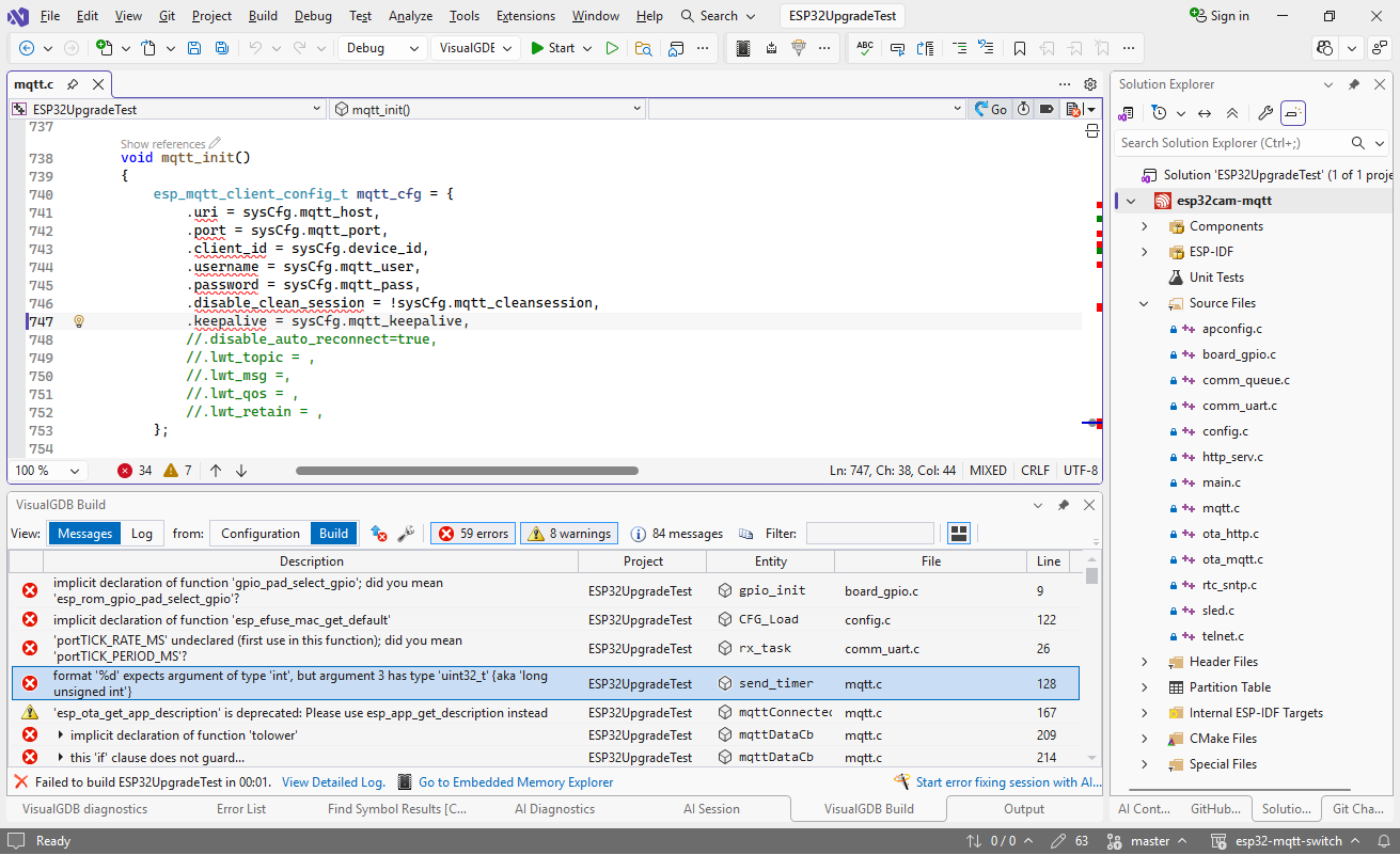 If you look closely, many of them have similar causes. E.g. the MQTT configuration struct now uses nested structs (see the migration guide) and using signed format specifier (%d) for uint32_t now causes a compiler error. - Most of the errors are rather trivial to fix, as soon as you look at the correct definitions. However, since the definitions are spread between multiple header files, many classical AI tools will take too long to produce meaningful results. We will now use VisualGDB’s symbol-level edits to quickly fix the errors without spending too many tokens. Click on the edit button above mqtt_init():