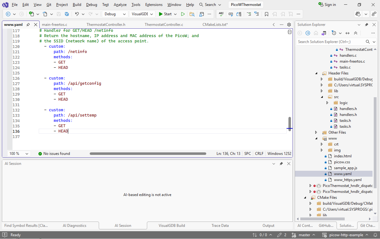 This tutorial continues the series where we are using AI to turn a third-party open-source HTTP server for Raspberry Pi Pico into a smart thermostat. In the previous tutorial we created a task for running the thermostat control loop, and added various helper functions. However, we did not implement the handlers for the API calls coming from JavaScript running in the user’s browser. In this tutorial we will show how to use AI to quickly create the missing functionality based on similar code that already exists in the project.