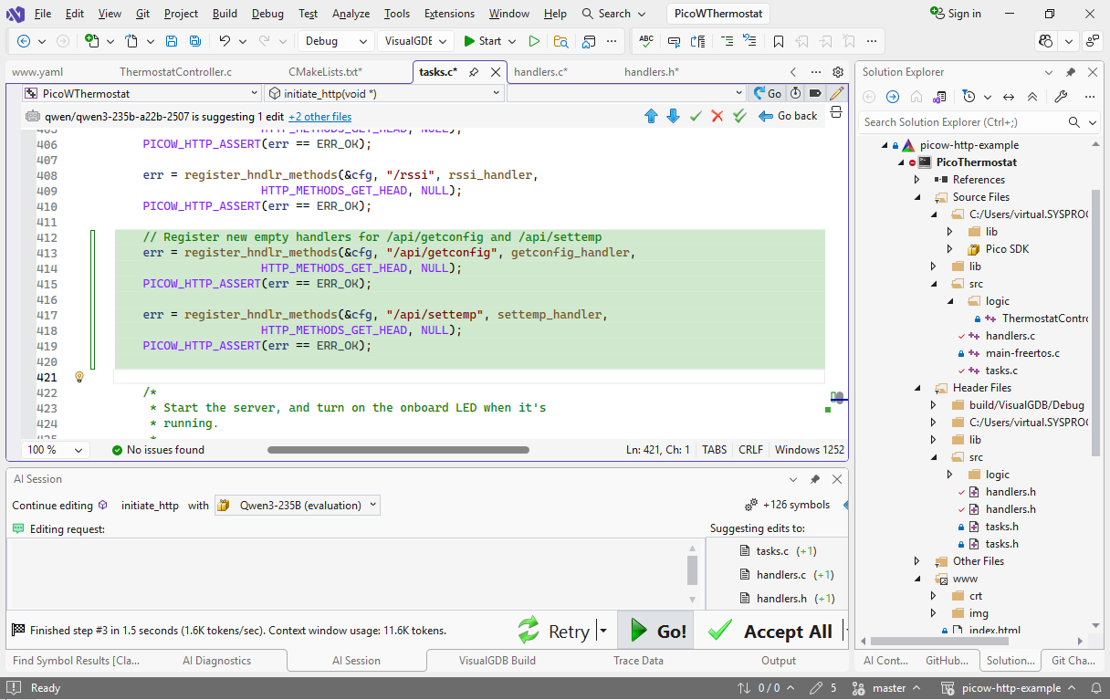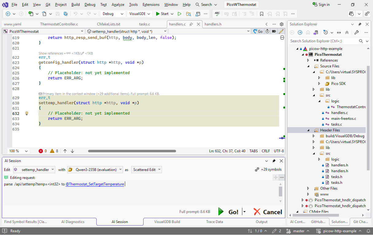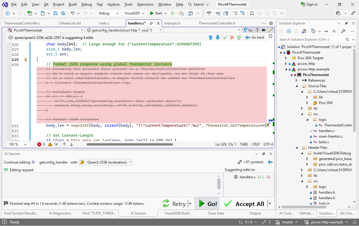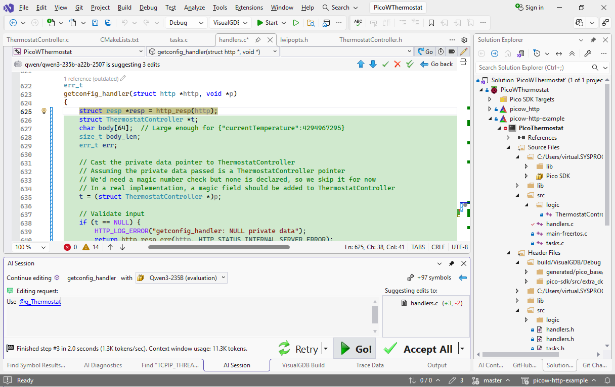Note that if we add it in read-only mode (glasses icon), the AI model will only see its declaration, but not the body. This is useful for functions that should be called, but not looked into. - Now you can click “Go” to run the edit. VisualGDB will automatically include the definitions of all functions used by led_handler(), including the preceding comments, so most models will have an easy time writing a usable function from the first try. In our example, it took the Qwen3-235B model slightly below 2 seconds to produce this implementation: