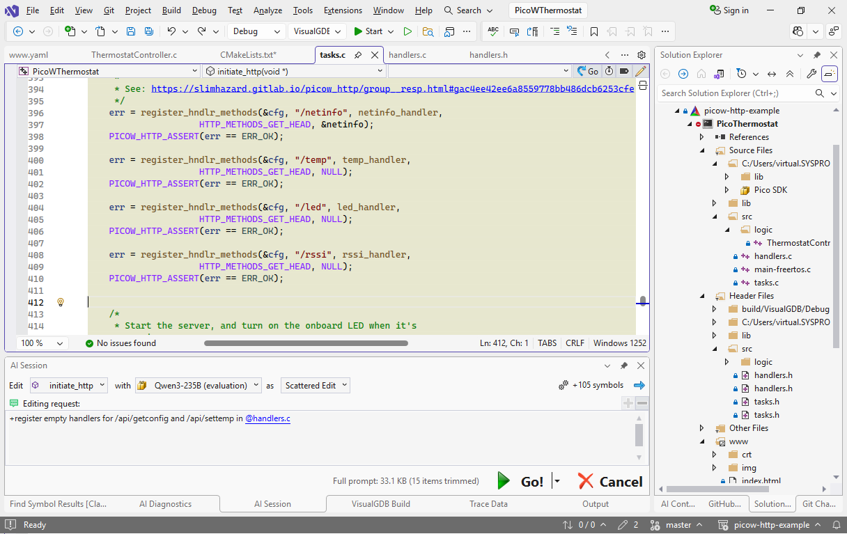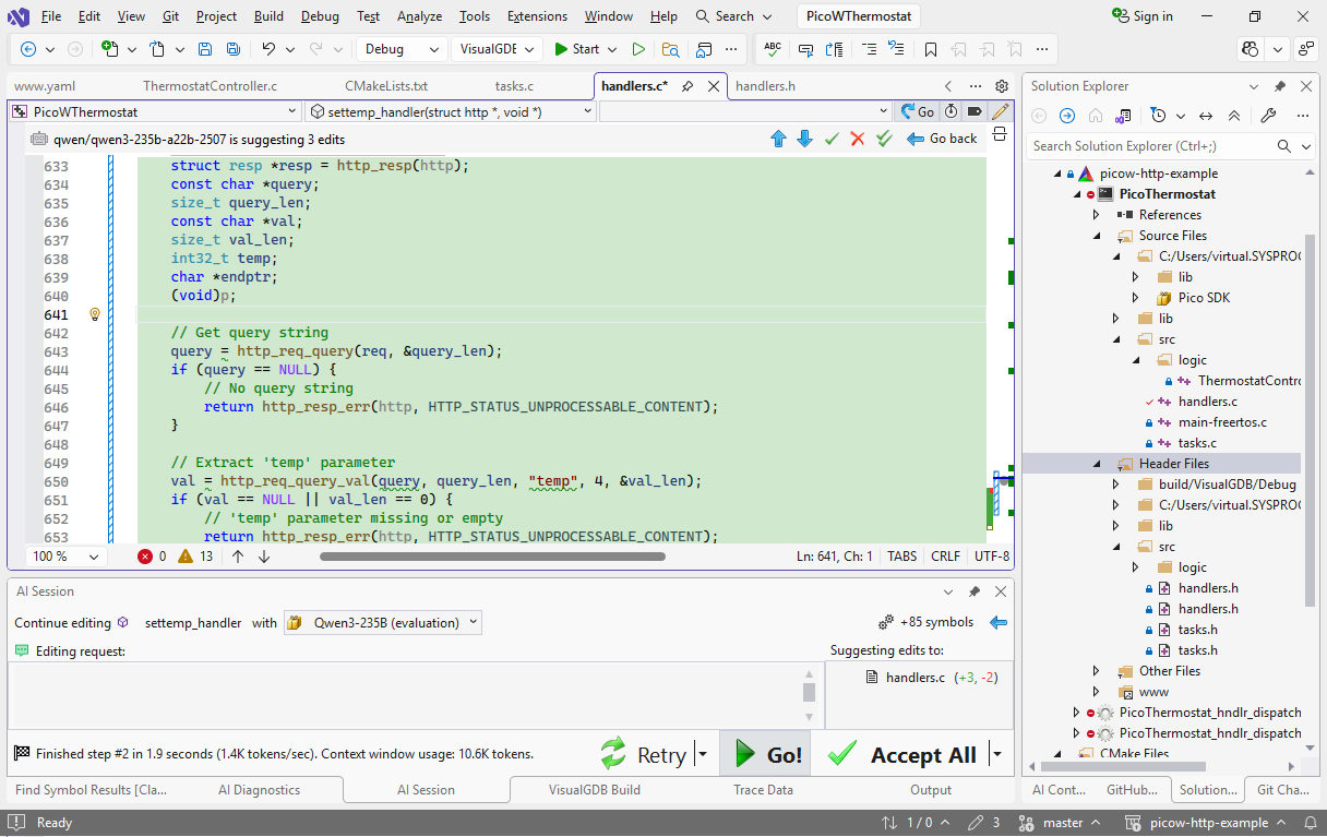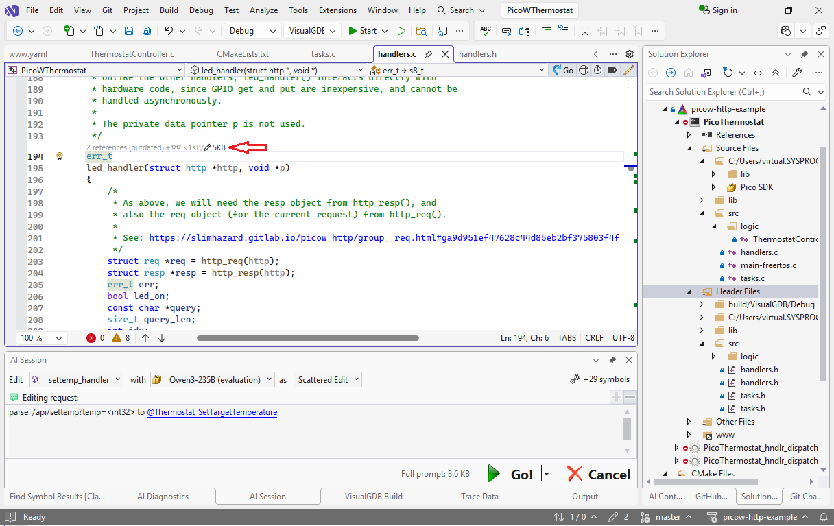 Note that if we add it in read-only mode (glasses icon), the AI model will only see its declaration, but not the body. This is useful for functions that should be called, but not looked into. - Now you can click “Go” to run the edit. VisualGDB will automatically include the definitions of all functions used by led_handler(), including the preceding comments, so most models will have an easy time writing a usable function from the first try. In our example, it took the Qwen3-235B model slightly below 2 seconds to produce this implementation: