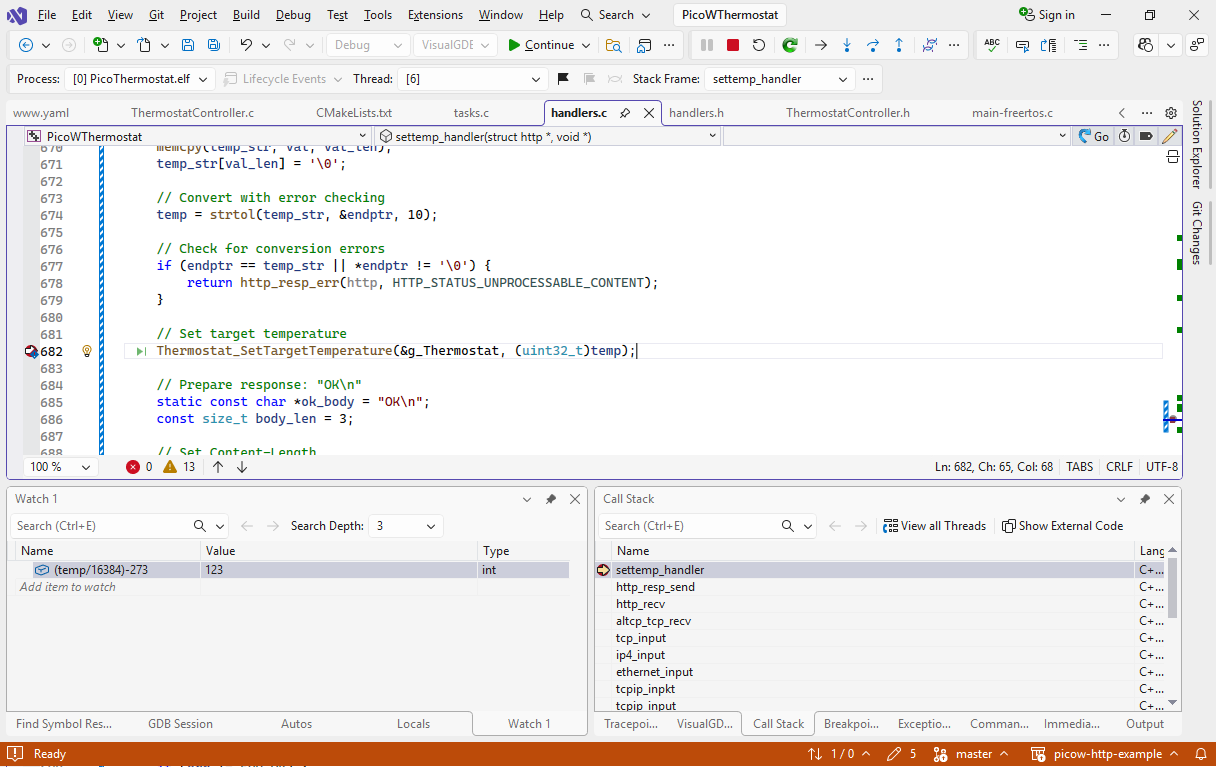Note that the language model copied a lot of logic from led_handler(), resulting in a bulky implementation. We will show later how to use AI-driven refactoring to simplify it. - Try setting a breakpoint in the new handler and setting the temperature in the web page to 123: